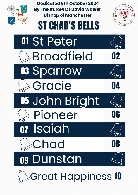 Helping young people engage with Church and Christian FaithThe churches of St Chad's and St Mary in the Baum are buildings which tell stories, both of faith and of the people of the town who built these fine buildings. We welcome schools and adult groups for educational visits and can organise a programme to suit your age group and curriculum objectives. We have "modules" prepared which cover church history, signs and symbols of faith, Christenings and Seasons of the Christian Year. We have also delivered a programme with Manchester Cathedral on the Five Pillars of Christianity, an innovative programme that explores the commonality between Christianity and Islam. At St Chad's we have been delighted to welcome children from Broadfield Park, St Peter's, Lower Place, Spotland, Newhey and Ashworth Valley Schools. We explore new ways each year seeking to improve the experience of children coming to St Chad’s to help them understand Christian faith. We would love you to come along and see us - get in touch. For more information please contact J Midgley or The Revd Anne Gilbert. Membership: S Fletcher, J Hill, J Midgley and others. (Please ask for details of our current risk assessment.) ![]() ![]() ![]() MOTHERS UNION The Mothers Union was founded by Mary Sumner, wife of the Rector of Old Aldresford, Hampshire, in 1876 and so it has been at the heart of Church life for many years.She was passionate about transforming the lives of Parish families and wanted to create an organisation that would bring together women, both rich and poor, to build a network that would help women support one another in the raising of their children in Christian faith. St Chad's group is currently in abeyance. If you would like to join please do let us know and we can tell you when it restarts. St Mary's Mothers Union meets regularly. More information to follow. BELL RINGING Co-ordinated by Debra Holmes, Tower Captain 0794 158 9540 More info also available from Simon Ripley 0779 871 5532 We are a group of bell ringers from St Chad's and sister churches, together with members of St Chad's PCC and the local community who have worked hard to get the bells restored. St Chad's Bell Ringers play a very important part in the life of the Church: they call people to worship. The sound of the bells can be heard across the town on Sunday mornings, and during the Tuesday evening practice. The Revd Mark Coleman (Vicar from 2014-2020, now retired) said, "We are so thrilled to have such a fine team of bell ringers, making joyful sounds echo across the town. When you hear the bells think about the good efforts of our ringers". We are always looking for people to join us and learn this ancient art. So, if you are interested in what is happening up in the tower, or would like to try out bellringing, please get in touch and contact us on 0794 158 0940 - you will be very welcome. Current activities include weekly practice sessions on Tuesday evenings from 7.30 pm to 9 pm for Sunday Services. The plans to renew the bells finally became possible, thanks to a sustained fund-raising campaign and a generous legacy to reach the target of approx £170k, and work to replace the existing peal of 8 bells with a peal of 10 bells began in December 2023. ![]() The new bells arrived in early May 2024 and were blessed on Sunday 19 May 2024, Pentecost, by The Bishop of Middleton, The Rt Revd Mark Davies. ![]() The installation completed, there was a Service of Dedication for the new bells led by The Bishop of Manchester, The Rt Revd Dr David Walker, on Sunday 6 October 2024. ![]() There was a competition for people to suggest names for the new bells. ![]() A comprehensive A4 booklet has been produced - please contact Debra or Simon to purchase a copy. |